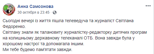 "Светлану знали как талантливую журналистку-редактора детских программ на бывшем государственном телеканале ОТБ. Она всегда была в хорошем настроении и помогала другим. Мы тебя будем помнить всегда", - написала Самсонова.