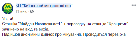 "Станцию "Майдан Незалежности" + пересадку на станцию "Крещатик" закрыли на вход и выход. Поступил анонимный звонок о минировании. Проводится проверка", - сказано в сообщении