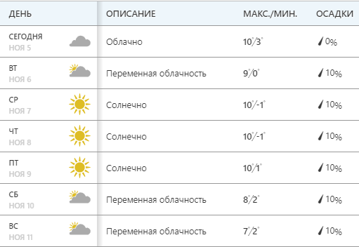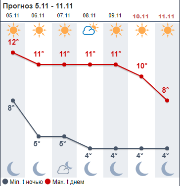 Сайт Weather.com обещает, что днем термометры покажут +9...+10, в понедельник пасмурно - далее переменная облачность и солнечная погода. На выходных +7...+8, переменная облачность, без осадков.