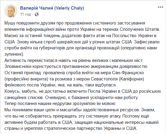 "Должен сообщить друзьям о продолжении системного применения элементов информационной войны против Украины на территории Соединенных Штатов. Есть за последнюю неделю дополнительные факты атак на Посольство Украины в США. Опять несколько попыток мошеннических действий в различных штатах США. Зафиксировали попытки выйти на губернаторов для организации провокаций (оперативно нами остановлены).