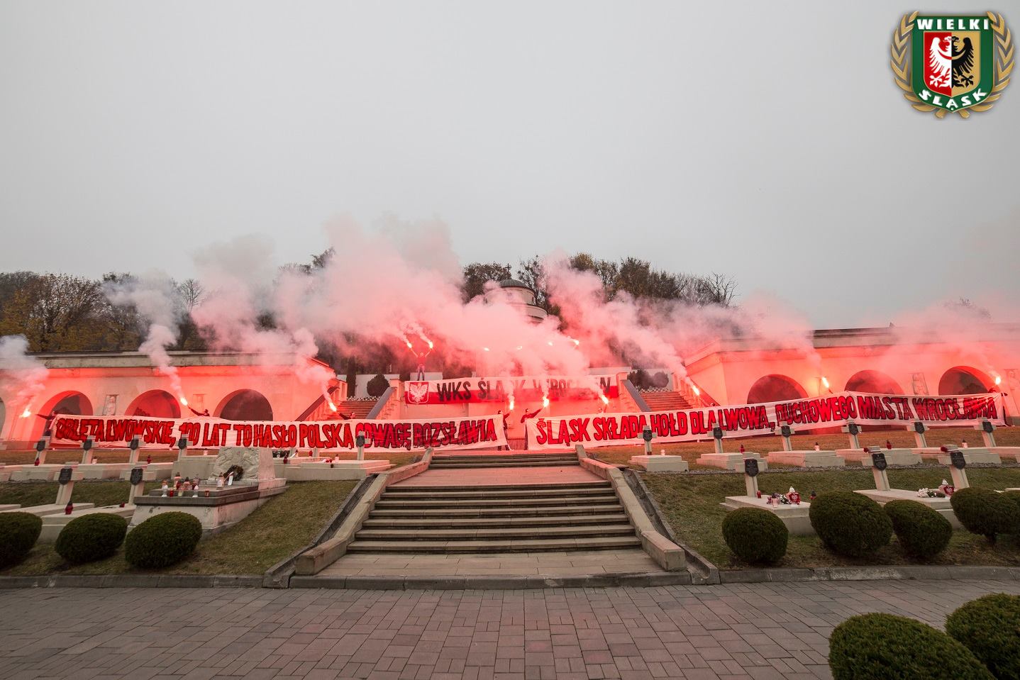 На фото видно, что около 10 мужчин на кладбище орлят развернули большой бело-красный транспарант с текстом "Орлята львовские, 100 лет - это лозунг польскую отвагу прославляет. Силезия отдает дань Львову, духовному городу Вроцлава". При этом фанаты зажгли более десяти файеров.