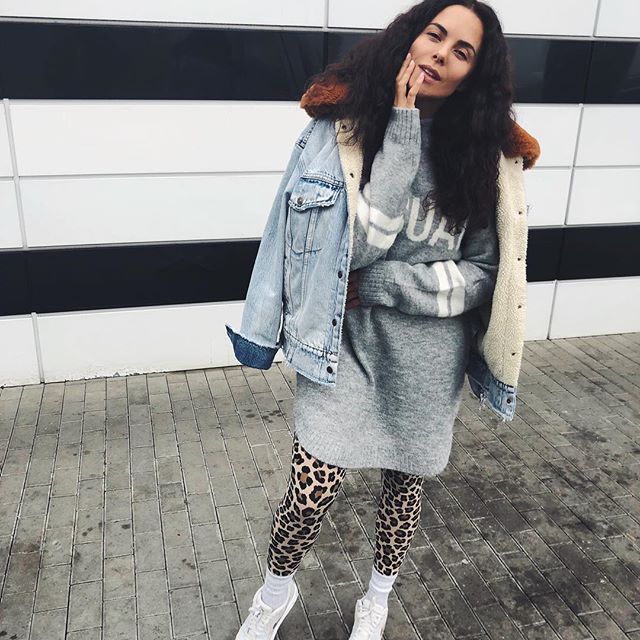 Так, например, Каменских позирует в леопардовых леггинсах, заправленных в носки. На ней также серый свитер оверсайз и свободная куртка. Спортивный образ дополняют белые кроссовки.