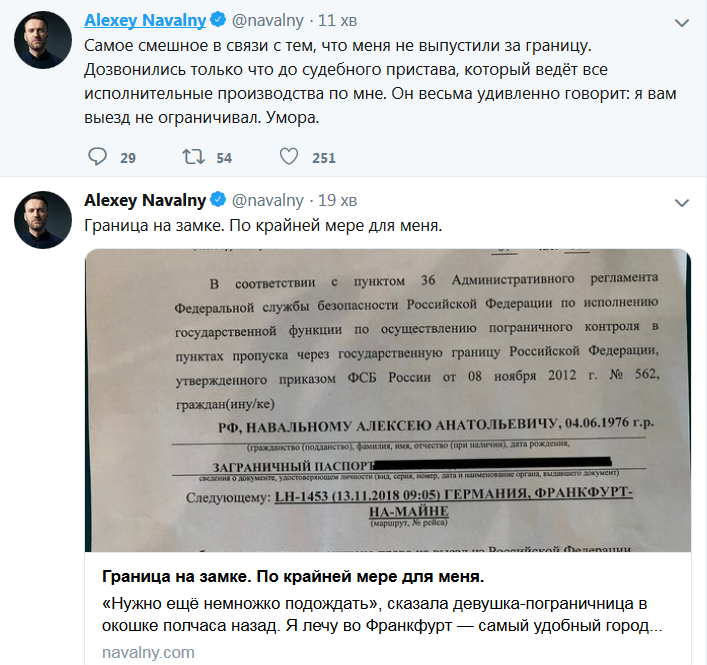 Сегодня утром, 13 ноября, в аэропорту Москвы задержали и не выпустили из России известного оппозиционера Алексея Навального. Об этом он сам сообщил в своем Twitter.