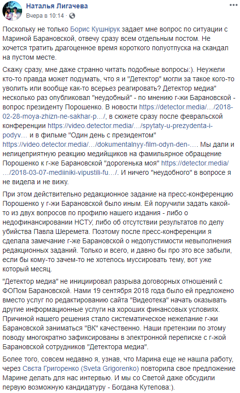 Позже, после реакции начальницы Барановской - главреда "Детектор медиа" Натальи Лигачевой - журналистка рассказала другие подробности своего ухода.