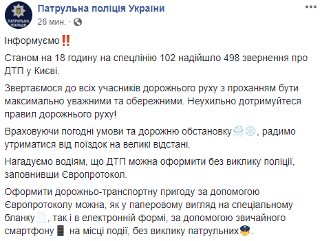 В Киеве по состоянию на 18:00 среды по спецлинии "102" поступило 498 обращений о дорожно-транспортных происшествиях в Киеве. К обеду показатель насчитывал почти 300 ДТП. Об этом сообщает Патрульная полиция Украины в Facebook.