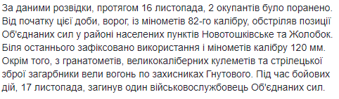На Донбассе в зоне проведения операции Объединенных сил 16 ноября погиб один украинский военный. Об этом сообщает пресс-центр ООС в Facebook.