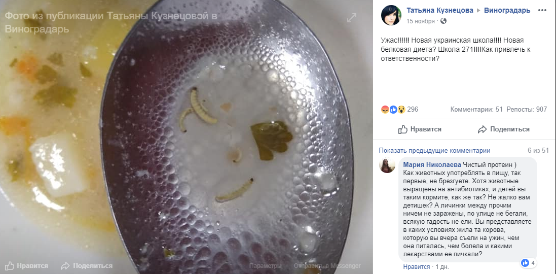 Пользователи соцсети разместили информацию о некачественной еде в столовой киевской школы №271. Родители публиковали фотографии супа с червяками, которым якобы кормили их детей. В тот же день в школе прошла проверка при участии Главного управления Госпотребслужбы Украины, которая опровергает информацию родителей. Об этом сообщает сайт КГГА.