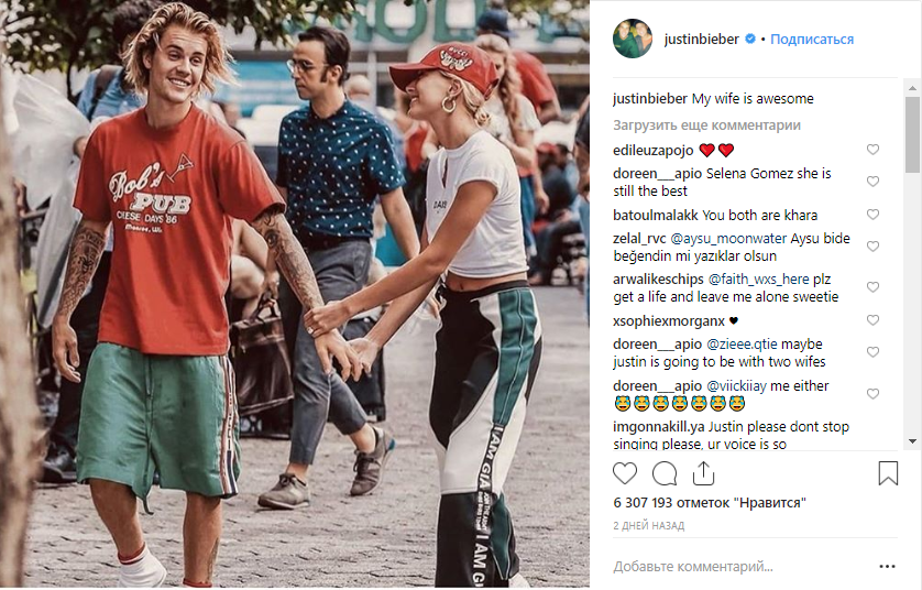 "Моя жена великолепна", - написал Бибер в Instagram под фото, на котором улыбающиеся возлюбленные держатся за руки. Сама модель уже изменила фамилию в своем аккаунте в социальной сети и стала Хейли Бибер.