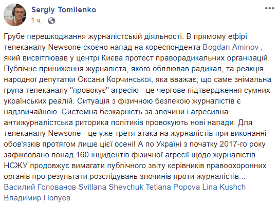 "Публичное унижение журналиста, которого оплевал радикал, и реакция народного депутата Оксаны Корчинской, которая считает, что именно съемочная группа телеканала "провоцирует" агрессию - это очередное подтверждение печальных украинских реалий. Ситуация с физической безопасностью журналистов является чрезвычайной. Системная безнаказанность за преступления и агрессивная антижурналистская риторика политиков провоцируют новые нападения. Для телеканала Newsone - это уже третья атака на журналистов при исполнении обязанностей в течение этой осени. А по Украине с начала 2017 года зафиксировано более 160 инцидентов физической агрессии в отношении журналистов.