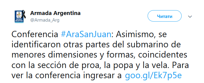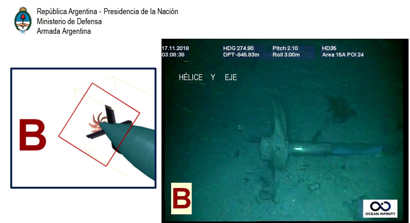 Командование ВМС Аргентины приняло решение опубликовать в Twitter первые фотографии затонувшей субмарины. На кадрах видно разрушенный мощным взрывом корпус подлодки. Также гребной винт субмарины лежит отдельно от корпуса.
