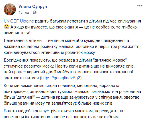 Исполняющая обязанности главы Минздрава Ульяна Супрун поделилась с украинцами очередной порцией советов. В этот раз, в своем Facebook она рассказала, что специалисты UNICEF Ukraine советуют родителям побольше сюсюкать и лепетать с малышами.