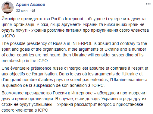 "Возможное президенство России в Интерполе - абсурдно и противоречит духу и целям организации. В cлучае, если доводы Украины и ряда других стран не будут услышаны – Украина рассмотрит вопрос о приостановке своего членства в ICPO", - подчеркнул Аваков перед днем ​​голосования, во время 87-й сессии Генеральной Ассамблеи Интерпола в Дубае.