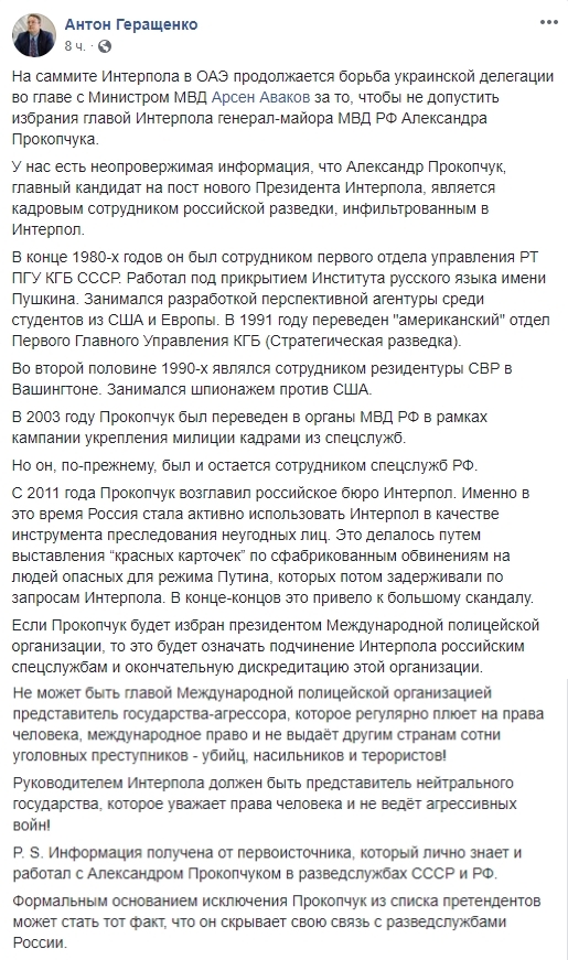 "На саммите Интерпола в ОАЭ продолжается борьба украинской делегации во главе с Министром МВД Арсен Аваков за то, чтобы не допустить избрания главой Интерпола генерал-майора МВД РФ Александра Прокопчука.