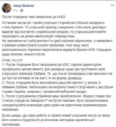 Боднар, в частности, уточнил, что посол Венгрии был приглашен в МИД Украины директором профильного департамента для демарша относительно деструктивных заявлений венгерского премьер-министра Виктора Орбана.