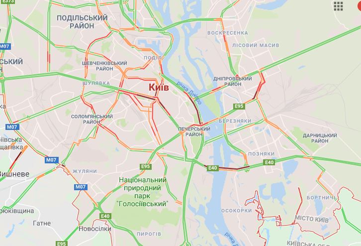 Наибольшие заторы наблюдаются в центре Киева, где проходят протесты владельцев авто на еврономерах. Пробки образовались на Подоле, в районе станции метро "Липки", на улице Вадима Гетьмана, на бульваре Вацлава Гавела, на улице Народного Ополчения, на проспекте Валерия Лобановского, на улице Васильковской, на Броварском проспекте, на Набережном шоссе, на улице Московской, на бульваре Перова. Почти не двигается Большая окружная дорога и Кольцевая дорога.
