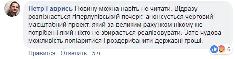 "Сразу распознается гиперлуповский почерк: анонсируется очередной масштабный проект, по большому счету никому не нужен и который никто не собирается реализовывать. Зато прекрасная возможность попиариться и раздерибанить государственные деньги".