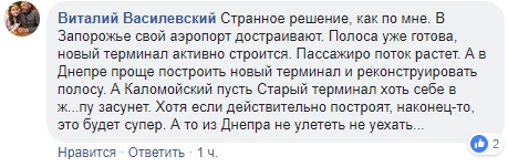 Другие комментаторы обращают внимание на то, что не мешало бы сначала таки достроить аэропорт в Запорожье: "Странное решение, как по мне. В Запорожье свой аэропорт достраивают. Полоса уже готова, новый терминал активно строится. Пассажиро поток растет. А в Днепре проще построить новый терминал и реконструировать полосу. А Коломойский пусть Старый терминал хоть себе в ж...пу засунет. Хотя если действительно построят, наконец-то, это будет супер. А то из Днепра не улететь не уехать..."