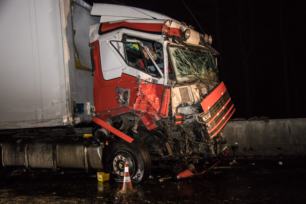 Авария произошла около 18:30. На 30-ом км трассы Киев - Одесса столкнулись фуры DAF и Volvo, которые ехали в сторону Белой Церкви. Volvo немного затормозил, а DAF не успел среагировать на маневр и врезался в него. Кабина DAF в аварии сильно повредилась, однако, по данным правоохранителей, обошлось без пострадавших.