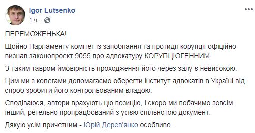 "Этим мы с коллегами помогаем предохранить институт адвокатов в Украине от попыток сделать его контролируемым властью", - сообщил Луценко, который считает, что с таким "клеймом" вероятность прохождения проекта 9055 через зал невысока. "Надеюсь, авторы учтут эту позицию, и скоро мы увидим совсем другой, тщательно проработанный со всем сообществом документ", - отметил нардеп.