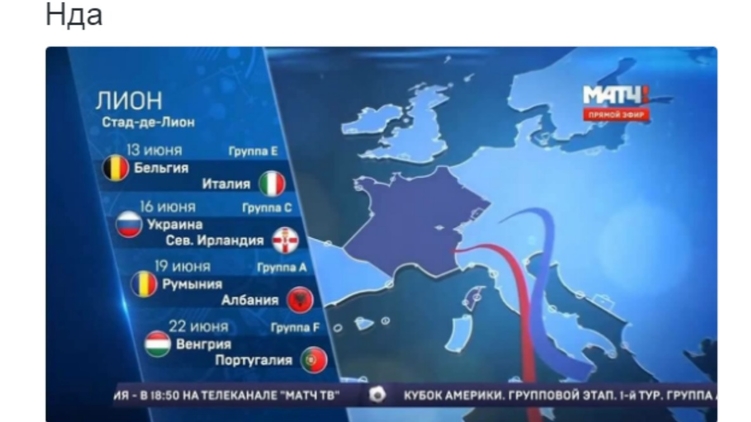 Российский телеканал "Матч ТВ" в материале о расписании игр Евро-2016, вместо флага Украины разместил российский триколор. Экс-комментатор "Матч-ТВ" Алексей Андронов разместил данное фото на своей странице в твиттере, передает УНН.