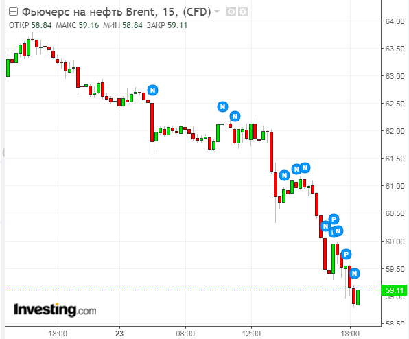 К 16:25 январский фьючерс на Brent подешевел до $59,77 за баррель. До этого цена опускалась до $59,41.