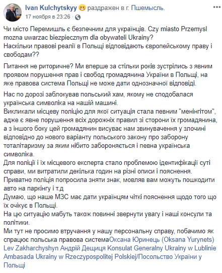 17 ноября житель Перемышля Томаш заблокировал автомобиль Кульчицкого и вызвал полицию из-за наклейки с изображением тризуба на заднем бампере. Обвинение заключалось в том, что тризуб был изображен не золотым на синем фоне, а красным на черном.