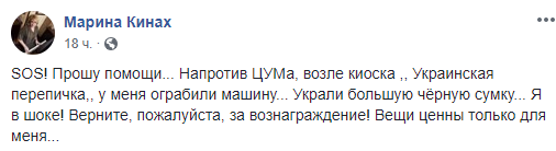 "SOS! Прошу помощи... Напротив ЦУМа, возле киоска "Украинская перепичка", у меня ограбили машину... Украли большую чёрную сумку... Я в шоке! Верните, пожалуйста, за вознаграждение! Вещи ценны только для меня...", - написала Кинах.
