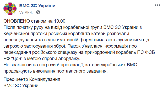 "После начала движения на выход корабельной группы ВМС ВС Украины из Керченского пролива российские корабли и катера начали преследование и в ультимативной форме требуют остановиться под угрозой применения оружия", - говорится в сообщении.
