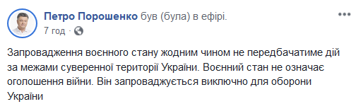 23:55 Нардеп от БПП пишет, что если СНБО предложит президенту ввести военное положение (на всей территории страны или в отдельных регионах), то, согласно закону, президент обязан издать соответсвующий указ и немедленно обратиться к парламенту за его утверждением. Для рассмотрения указа парламент обязан собраться в течение двух суток без дополнительного созыва.