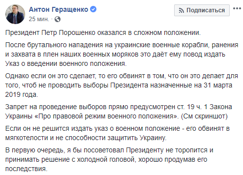 00:17 Нардеп от Народного фронта Антон Геращенко заявил, что президент оказался в сложном положении, что дает ему право ввести военное положение, но он бы посоветовал не торопиться.