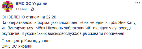 "По оперативной информации захвачен малый бронированный артиллерийский катер "Бердянск" и рейдовый буксир "Яны Капу". Малый бронированный артиллерийский катер "Никополь" заблокирован и следует в сопровождении оккупантов. 6 украинских военнослужащих получили ранения", - говорится в сообщении по состоянию на 22:20.