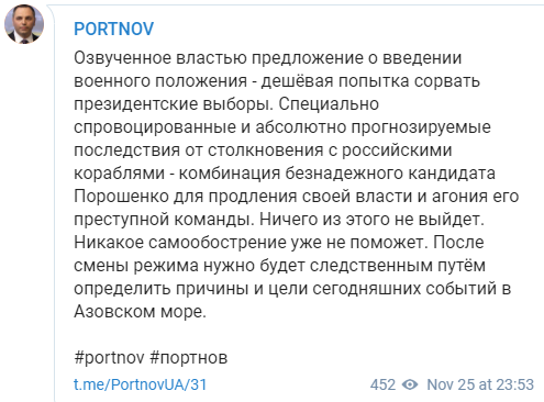 "Озвученное властью предложение о введении военного положения - дешевая попытка сорвать президентские выборы. Специально спровоцированные и абсолютно прогнозируемые последствия от столкновения с российскими кораблями - комбинация безнадежного кандидата Порошенко для продления своей власти и агония его преступной команды. Ничего из этого не выйдет. Никакое самообострение уже не поможет. После смены режима нужно будет следственным путем определить причины и цели сегодняшних событий в Азовском море" - написал Портнов.