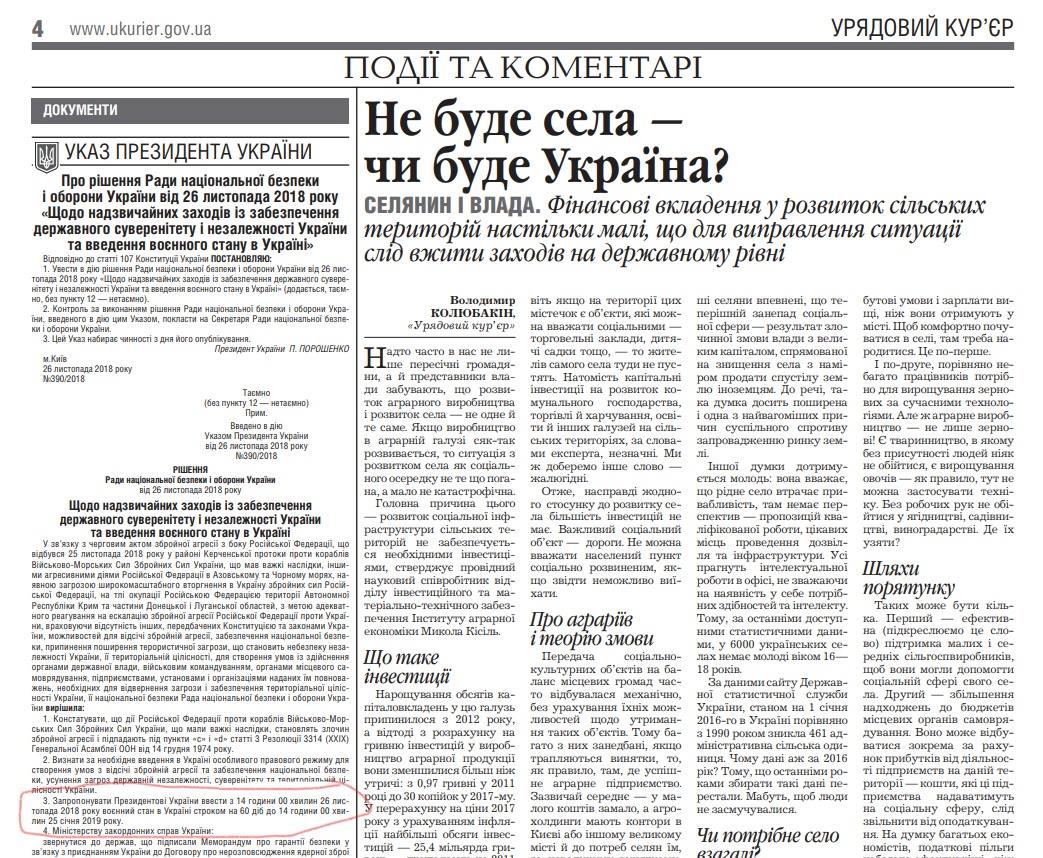 В правительственной газете "Урядовый курьер" от 27 ноября опубликован указ президента, которым военное положение вводится на 60 дней и на всей территории Украины.