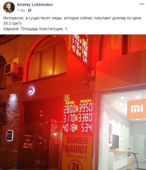 А в сети распространяли фото из Харькова, на котором видно, как в самом центре города предлагают купить доллар по курсу 39,5.