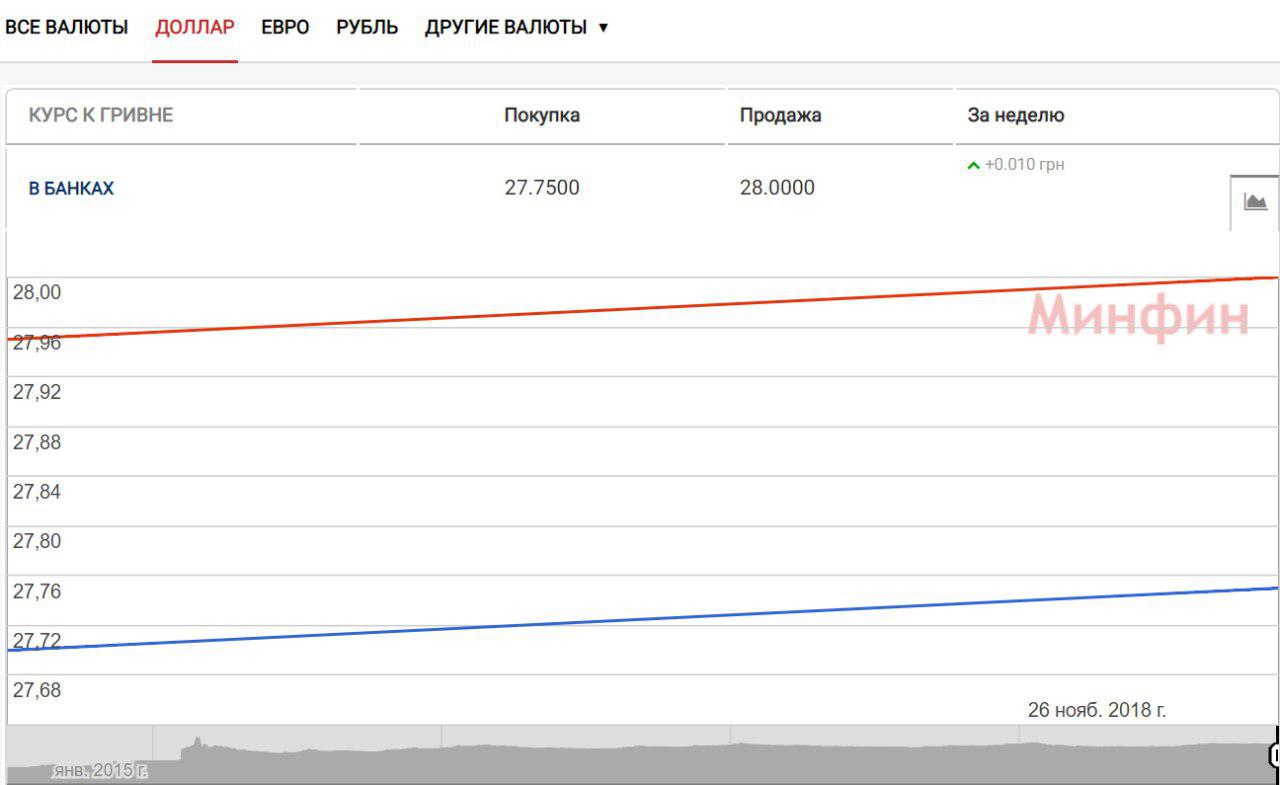 Нацбанк Украины утром установил официальный курс основных валют. Американский доллар подорожал на 10 копеек по сравнению с предыдущим банковским днем, 26 ноября, и составил 27,9 грн.