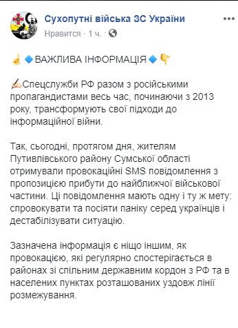 Министерство обороны заявляет, что Российская Федерация рассылает от имени украинского оборонного ведомства SMS-сообщения жителям граничащих с ней областей Украины с призывом прибыть в ближайшую воинскую часть. Об этом говорится в сообщении пресс-службы ведомства в Facebook.
