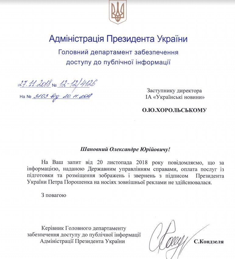 В частности, журналисты интересовались, какая организация либо подразделение занимается размещением рекламы с подписью президента, на каких условиях распространяется эта реклама, а также какова стоимость кампании и расходовались ли на нее бюджетные деньги. "По информации, предоставленной Государственным управлением делами, оплата услуг по подготовке и размещению изображений и обращений с подписью президента Украины Петра Порошенко на носителях внешней рекламы не осуществлялась", - говорится в ответе Администрации президента.