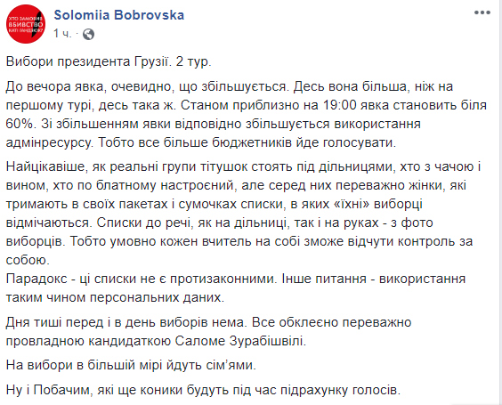 По словам общественной активистки Соломии Бобровской, явка по состоянию на 19:00 в Грузии составляла около 90%. При этом она акцентирует, что возле избирательных участков стоят люди, преимущественно женщины, со списками избирателей, в которых отмечаются те, кто пришел.