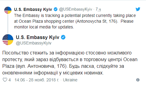 "Посольство следит за информацией относительно возможного протеста, который сейчас происходит в торговом центре Ocean Plaza", – сказано в сообщении.