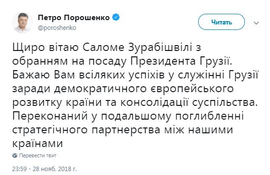 Президент Украины Петр Порошенко в полночь, 29 ноября, поздравил Саломе Зурабишвили с победой на выборах президента Грузии. Об этом глава государства написал на своей странице в Twitter.