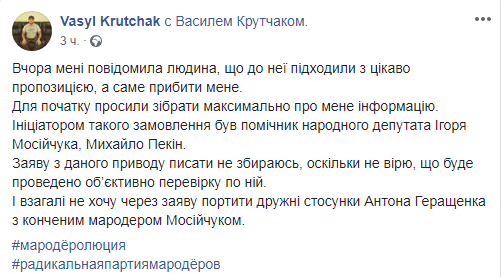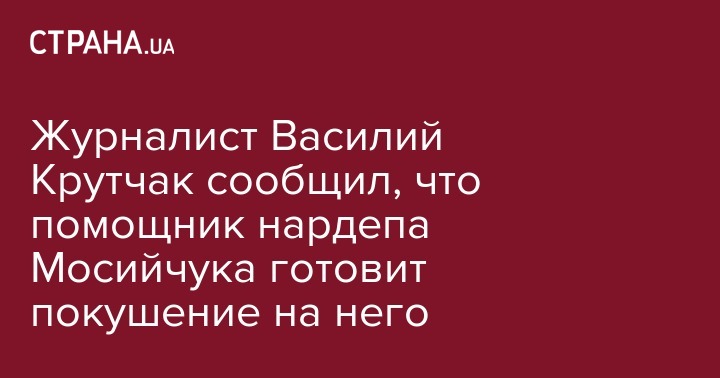 Журналист Василий Крутчак сообщил, что помощник народного депутата от Радикальной партии Игоря Мосийчука готовит на него покушение. Об этом он написал на своей странице в Facebook, ссылаясь на информацию от человека, которому предложили "прибить журналиста".