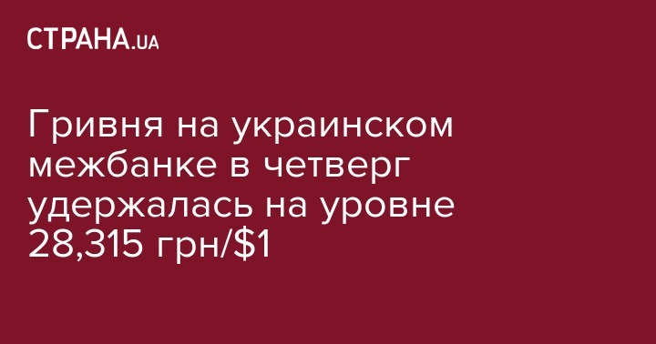 Гривня на украинском межбанке в четверг удержалась на уровне 28,315 грн/$1