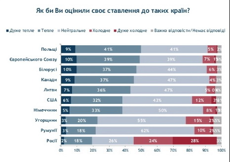 Опрос показал, что 52% украинцев чувствуют "холодное" или "очень холодное" отношение к России. Более теплое отношение опрошенные граждане Украины испытывали к Польше (50%), Евросоюзу в целом (49%) и Беларуси (47%). Процент опрошенных украинцев, которые относятся к этим странам (и объединениям) "холодно" или "очень холодно" относительно небольшой: Польша (5%), ЕС (8%), Беларусь (6%).
