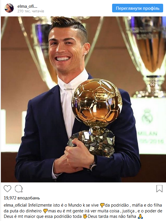 Сестра КриРо Элма Авейру крайне резко отреагировала на такой исход голосования футбольных специалистов.