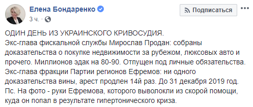 "Политические репрессии в Украине идут полным ходом, это касается каждого. То что творят с Ефремовым в суде, которому идёт седьмой десяток лет, лишь маленькая часть того беспредела, что творит этот режим. Если медицинскую помощь принципиально не оказывают Ефремову, подталкивая его в могилу, представьте как работает на уничтожение система в отношении остальных...".