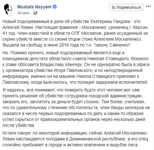 "Новый подозреваемый в деле об убийстве Екатерины Гандзюк – это Алексей Левин (ранее эту информацию подтвердила "Страна"). Настоящая фамилия – Москаленко, уроженец г. Херсон, 41 год. Член известной в области ОПГ Москалов, ранее осужденный за серию убийств вместе со своим отцом (тоже Алексеем Москаленко). Вышел на свободу в июне 2016 года по т.н. "закону Савченко", - написал Найем. Он добавил, что Левин является помощником депутата областного совета Николая Ставицкого, близкого к главе облсовета Владиславу Мангеру.