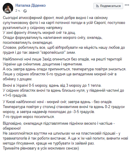 5 декабря атмосферный фронт, царящий во всей Европе, постепенно будет двигаться в восточном направлении - в сторону Украины. Об этом сообщила синоптик Наталья Диденко на своей странице в Facebook.