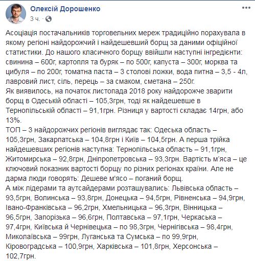 По состоянию на начало ноября дороже всего сварить борщ в Одесской области - 105,3 грн, дешевле - в Тернопольской области - 91,1 грн. Разница в стоимости составляет 14 грн, или 13%. Об этом написал глава Ассоциации поставщиков торговых сетей Алексей Дорошенко, ссылаясь на данные официальной статистики,  на своей странице в социальной сети Facebook.