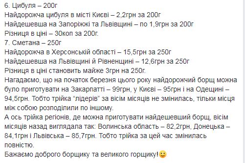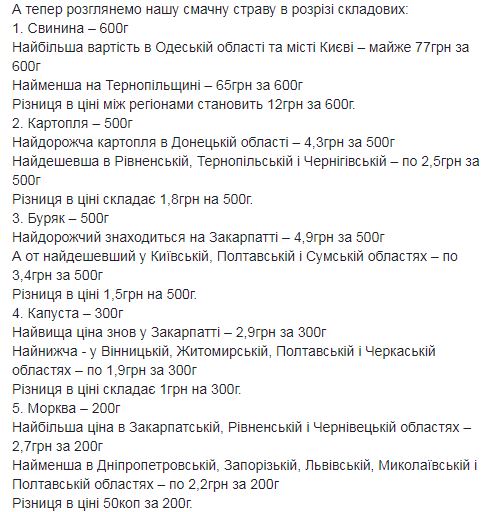 Кроме Одесской в ​​тройку лидеров по стоимости борща также вошли Закарпатская область - 104,8 грн и Киев - 104,5 грн. Первая тройка самых дешевых регионов такая: Тернопольская область - 91,1 грн, Житомирская - 92,8 грн, Днепропетровская - 93,3 грн.