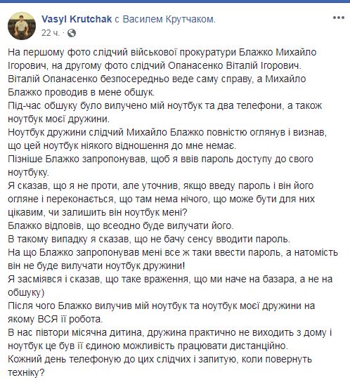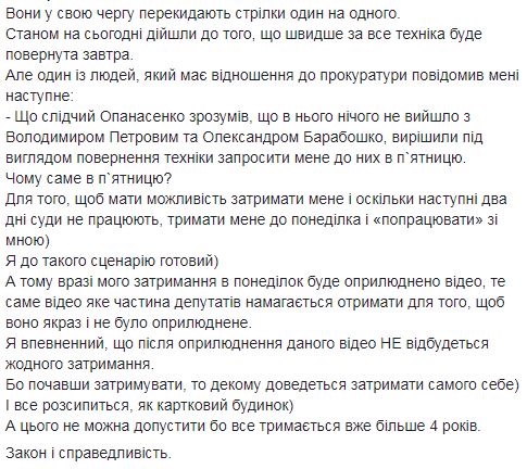 "Следователь Виталий Опанасенко понял, что у него ничего не получилось с Владимиром Петровым и Александром Барабошко, решил под видом возврата техники пригласить меня к ним в пятницу. Почему именно в пятницу? Для того, чтобы иметь возможность задержать меня и так следующие два дня суды не работают, держать меня до понедельника и "поработать" со мной", - написал журналист.